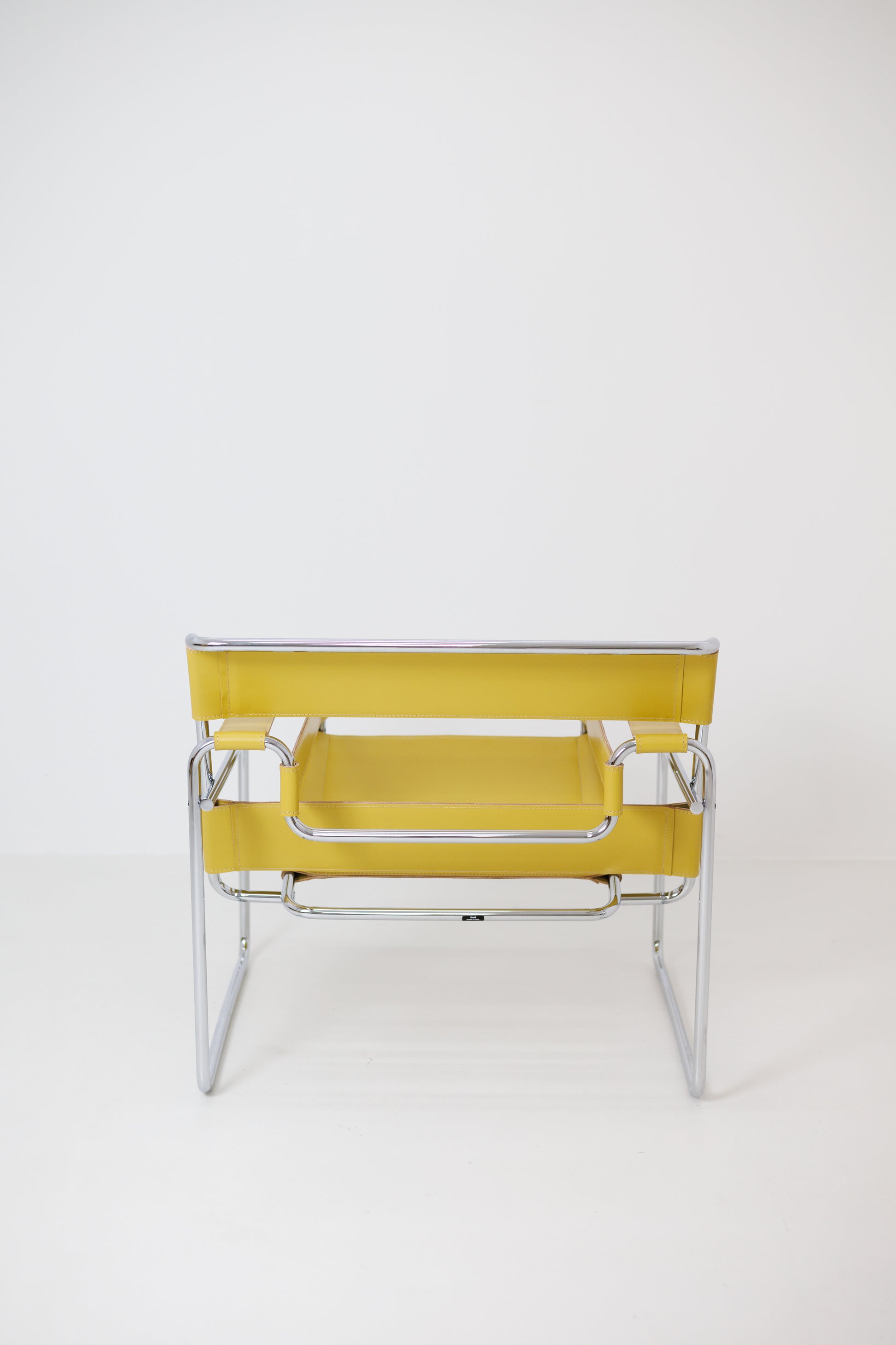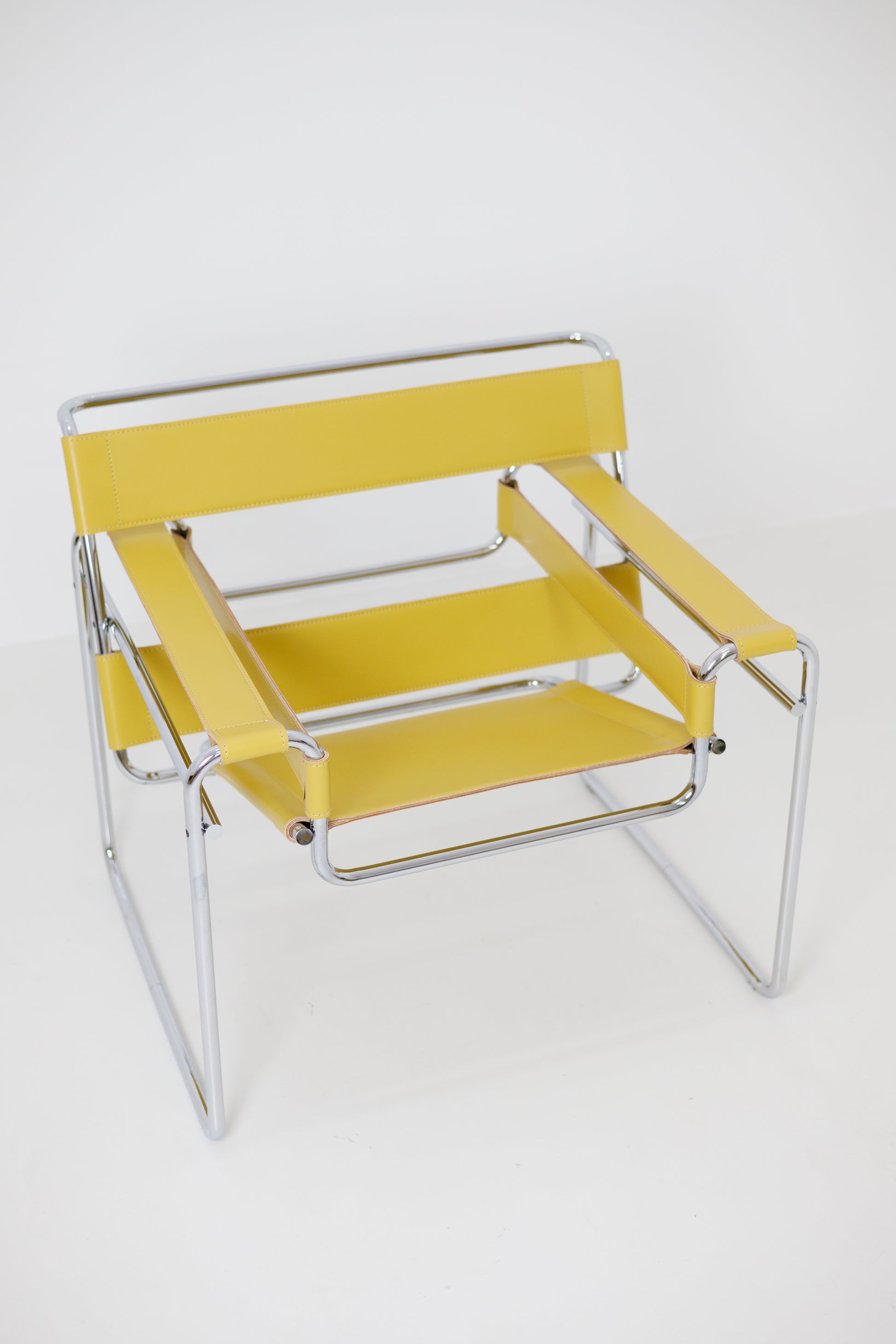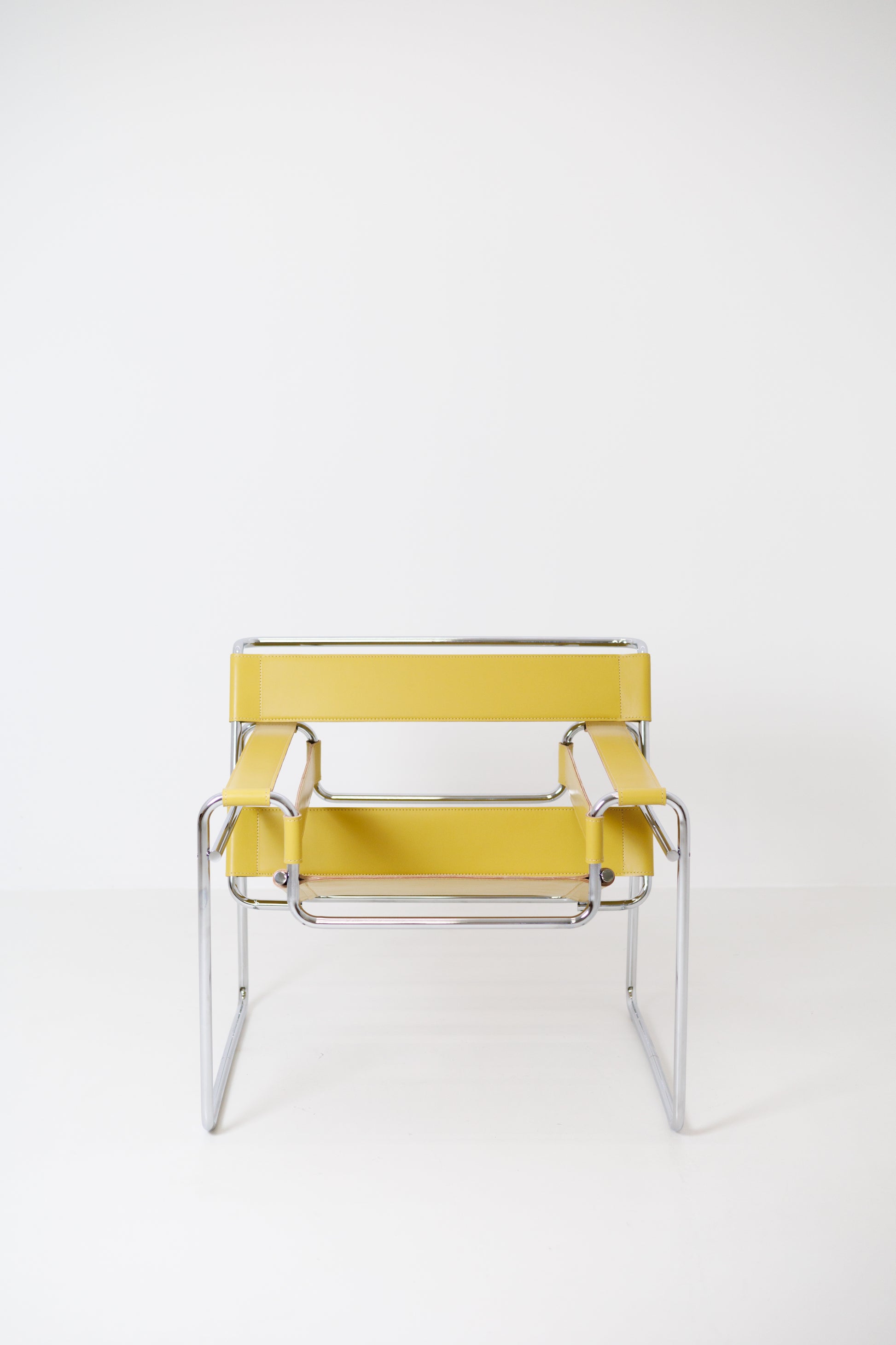 The chair's structure is made of steel tubes, exemplifying the rationalist approach that Breuer is renowned for. The chair's yellow leather is in perfect condition.