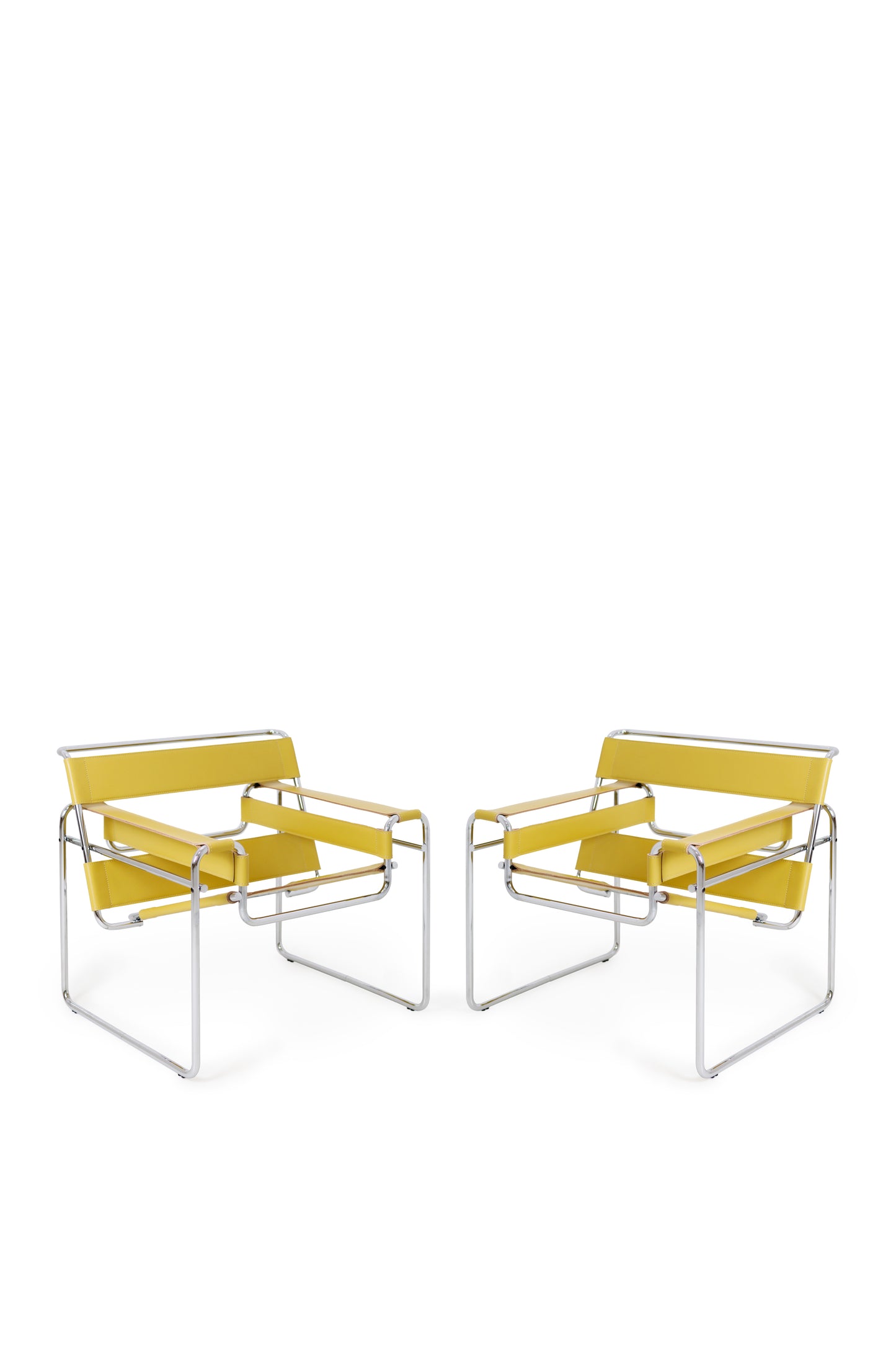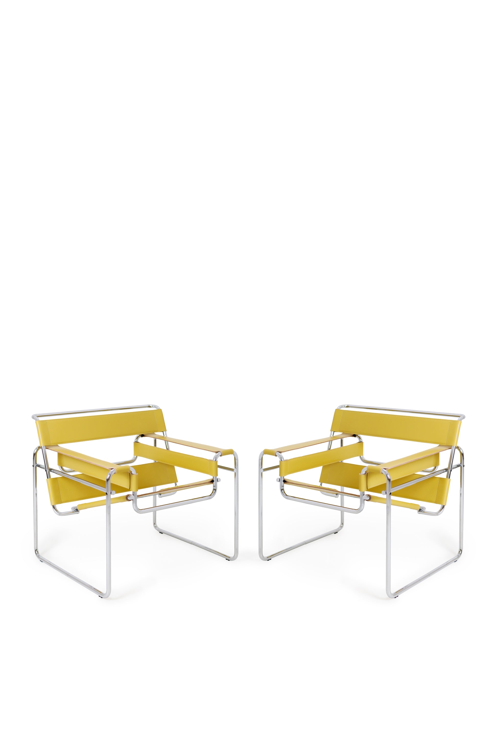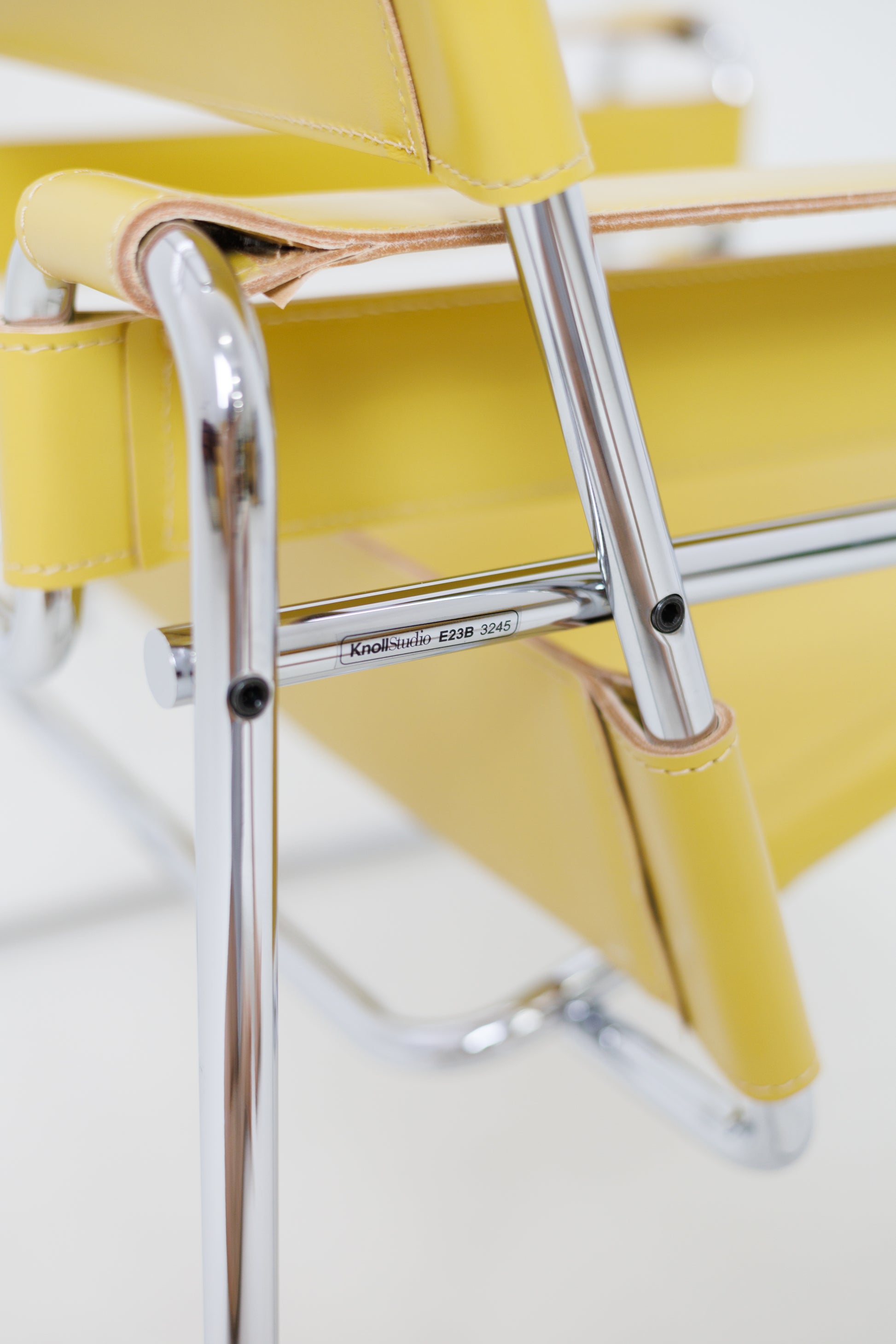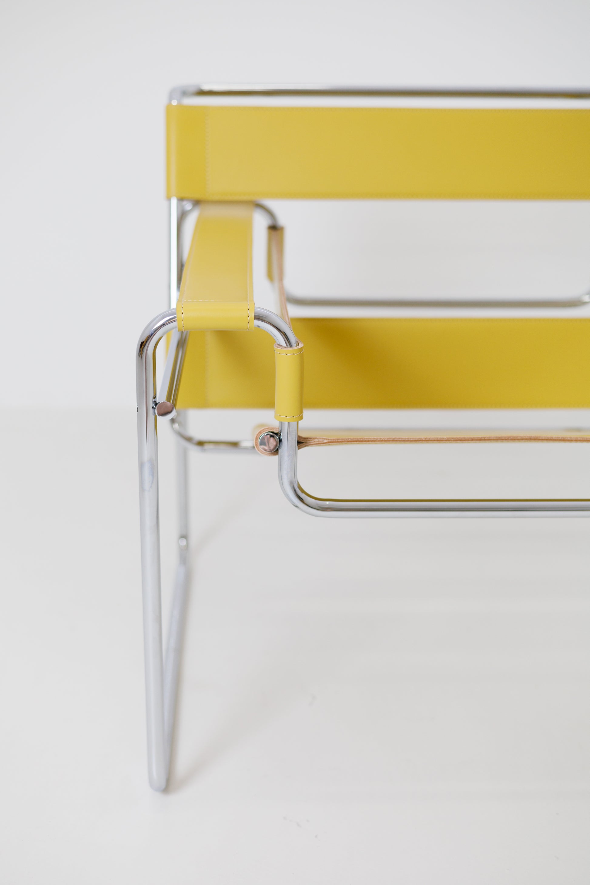 The chair's structure is made of steel tubes, exemplifying the rationalist approach that Breuer is renowned for. The chair's yellow leather is in perfect condition.